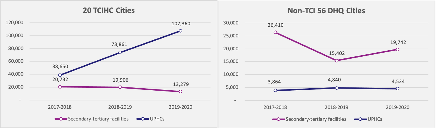 These efforts not only led to increases in annual client volume and improvements in method mix but also the decongestion of district level facilities. For the 20 TCIHC-supported cities, IUCD uptake at UPHCs increased by more than 230% from approximately 33,000 in 2017-18 to over 100,000 in 2019-2020, according to HMIS.