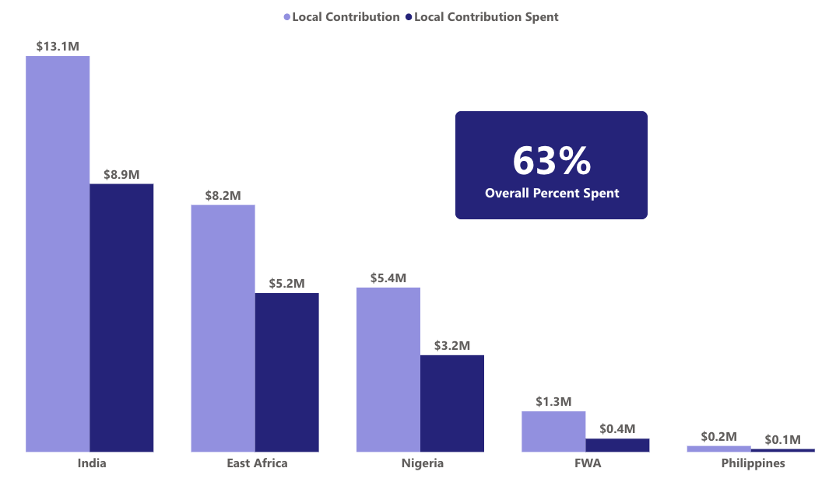 TCI commitments in the first phase were $28.2 million but varied by hub, with India leading the way with $13.1 million, followed by East Africa at $8.2 million. In the period from July 2020 to February 2022, 73% of the local government committed funds were spent across the four hubs, with Nigeria (88%) and East Africa (87%) leading the way. Average spending by local governments across the entirety of phase one stands at 63%; as highlighted in the graph below. Local commitments made during the final five months of the first phase (Nov. 1, 2021 – Feb. 28, 2022) are not included in these calculations because they go towards activities that will occur under the second phase period.