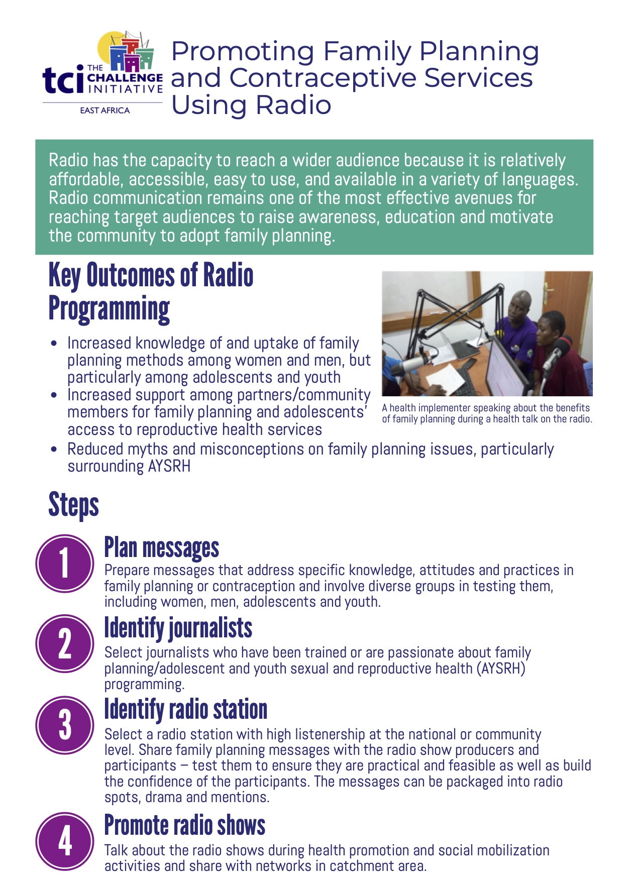Radio communication remains one of the most effective avenues for reaching target audiences to raise awareness, education and motivate the community to adopt family planning