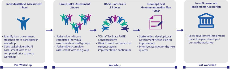 - Participants discuss completed individual assessments in small groups and complete the tool as a group. Note: The RAISE tool is adaptable, and implementers can adjust accordingly to local context and existing government structures.