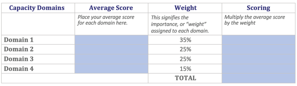 - At the end of the assessment, use the Level of Implementation computation form (Table below) to get the final score. This is determined by weighting each domain and then computing an overall percentage. The criteria for each score are outlined in the tool itself.
