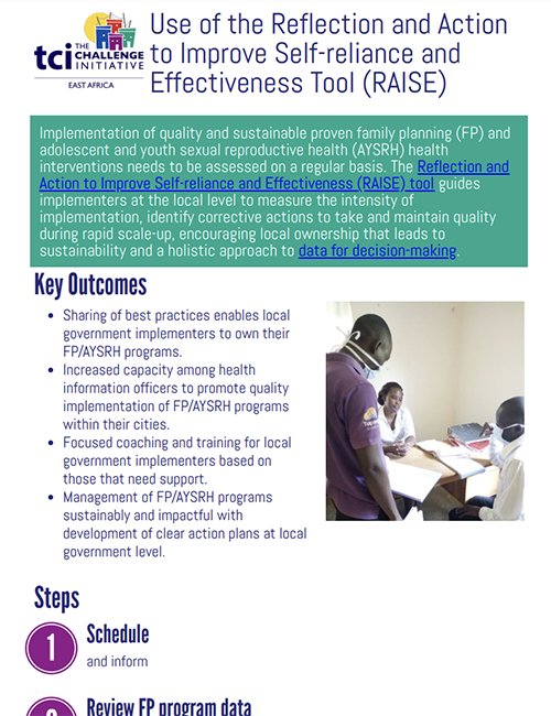 Implementation of quality and sustainable proven family planning (FP) and adolescent and youth sexual and reproductive health (AYSRH) health interventions needs to be assessed on a regular basis. The Reflection and Action to Improve Self-reliance and Effectiveness (RAISE) tool guides implementers at the local level to measure the intensity of implementation, identify corrective actions to take and maintain quality during rapid scale-up, encouraging local ownership that leads to sustainability and a holistic approach to data for decision-making.