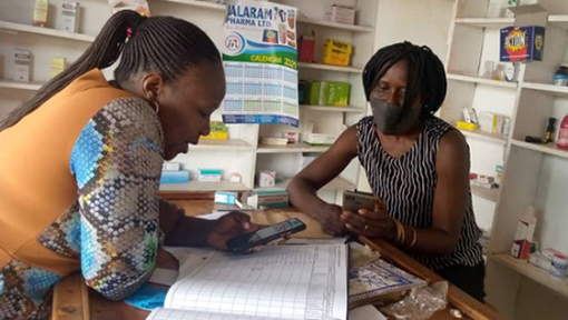 Coaching on data capture and reporting for a drug-shop attendant at Buikwe District, Uganda. Photo courtesy: Buikwe Family Planning health team.
