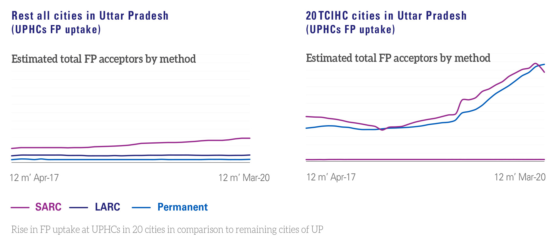 The reversing trend in UPHCs of TCI India supported cities annual client volume for Short-Acting Reversible Contraceptive (SARC) and Long-Acting Reversible Contraceptive (LARC) is visible with great significance, while in remaining cities the trend is diminishing especially for IUCD and stagnant for other methods. The contribution of IUCD in method mix is significant in TCI India cities and its contribution is also positive in city-level achievements. On the other hand, data from the remaining cities in UP reveals a total of 19,139 number of annual client volume in April 2017, which reached 32,397 number with 69% increase in March 2020. Additionally, there is a small increase recorded at UPHCs for SRAC (condoms, DMPA and oral contraceptive pills) and largely no change recorded in IUCD client volume in non TCIHC supported cities.