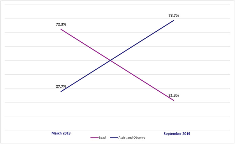 The PMIS data indicated that this strategy worked and increased skills and efficiencies of ASHAs to cater to the FP needs of the community. In Uttar Pradesh, over 20 months, around 6181 ASHAs were coached and over one million women were reached through the coaching calls. Around 80% of ASHAs shifted to ‘assist-observe’ stage from March 2018 (refer to line graph).