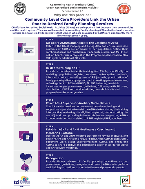 Purpose: This tool provides guidance on strengthening the role of urban Accredited Social Health Activists (ASHAs) through coaching and mentoring for facilitating utilization of quality Family Planning (FP) services among marginalized and vulnerable population in urban slums.