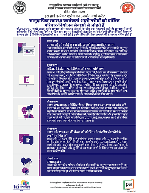 - Support urban ASHAs in generating awareness and mobilizing clients for FP