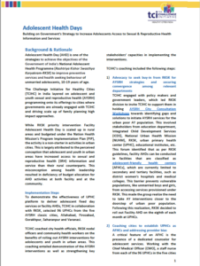 This short guide outlines how TCIHC has helped the state government of Uttar Pradesh to improve preventive services and health seeking behavior of unmarried adolescents, 10-19 years of age, by demonstrating Adolescent Health Day (AHD) – one of the Government of India’s National Adolescent Health Programme (Rashtriya Kishor Swasthya Karyakram-RKSK) strategies.