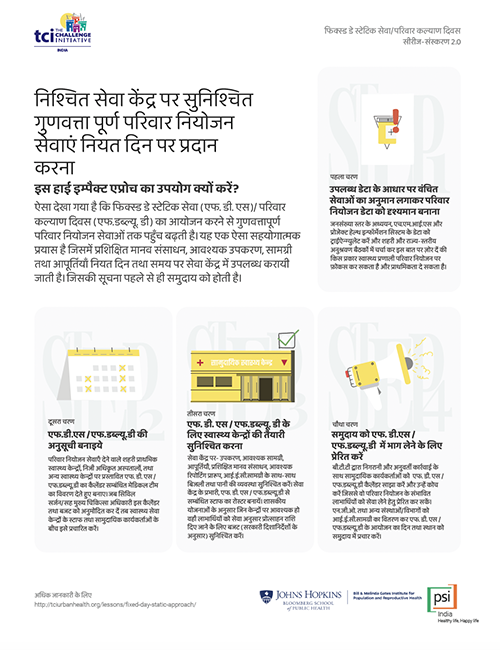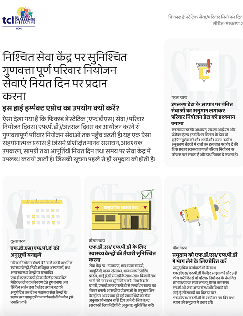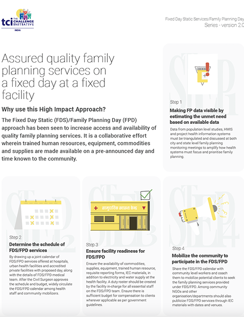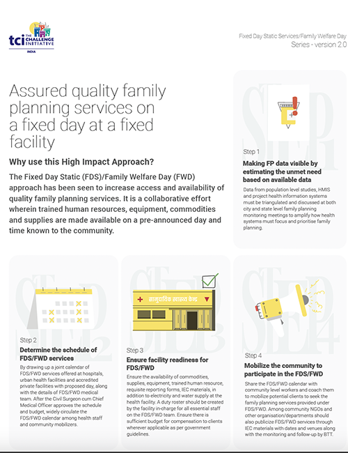 The government officials of Uttar Pradesh, Madhya Pradesh and Odisha implemented FDS/FPD approach with the coaching and mentoring support of The Challenge Initiative (TCI) India. Across 31 intervention cities of these three states, the FDS/FPD approach helped the government to maximize its use of limited human resources and increase the provision of FP in 503 urban primary health center (UPHCs). The experience revealed that when FDS/ FPD for FP were regularly organized in a facility, they enhanced the quality and utilization of routine FP services in that facility.