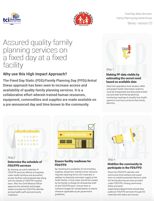 Purpose: This tool provides specific guidance on expanding access of quality Family Planning (FP) services at the doorstep of the most vulnerable populations, including urban poor. For the same, it coaches on thow to implement Fixed Day Static (FDS) Services/ Family Planning Day (FPD) /Antral diwas for offering the family planning basket of choice, including Long-Acting Reversible Contraception (LARC)/spacing methods at urban primary health centers (UPHCs), other higher order public facilities and accredited private sector health facilities.