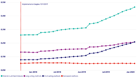 HMIS trends also show a rapid increase of short-acting reversible methods, including injectable contraceptives, and an increase in IUCD use. Figure 2 represents the increase in annual FP client volume. To prevent overestimation of short-term methods, HMIS data have been adjusted using standard couple-year protection, which is the total estimated protection provided by contraceptives in a one-year period. To account for seasonal variations, the data represent a 12-month average for short-acting methods and rolling sums for long-term and permanent methods. An increase in the trend therefore means that the latest month outperforms the same month from the last year.