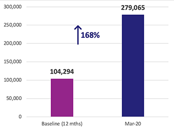 TCI India conducted two rounds of population-based surveys, which found that the modern contraceptive prevalence rate among currently married women (ages 15 to 49) in poor areas of cities increased significantly from 49.8% in Round 1 (September 2018) to 53.7% in Round 2 (September 2019). Furthermore, UPHC Health Management Information System (HMIS) (NHM, HMIS, 2019) data show that the TCI India program contributed a 168% increase in annual FP client volume as of March 2020 (compared with baseline), or 175,671 more clients accessing FP care (Figure 1). The UPHC proportion of FP clients is around 67% of the total annual FP client volume at the city level.