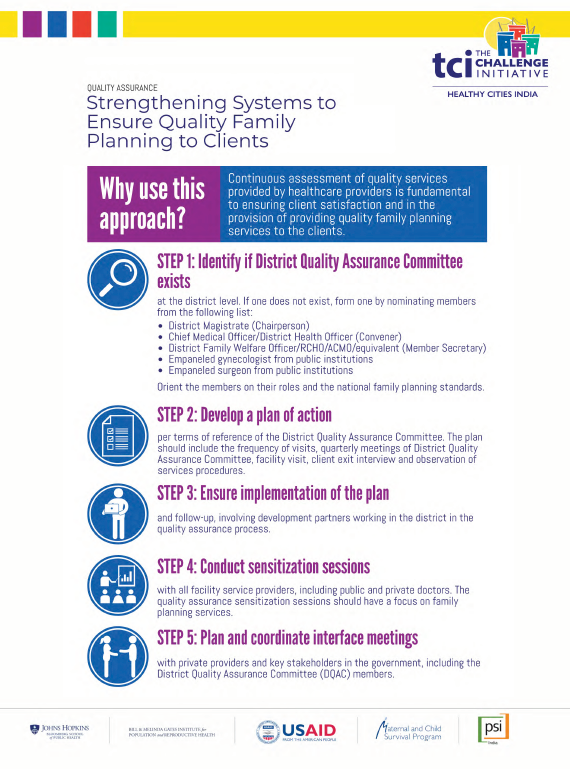 The National Quality Assurance (NQA) program provides guidelines towards ensuring quality in family planning services. To ensure adherence to NQA standards, Quality Assurance Committees/Units are formed to monitor all types of facilities including district hospitals, urban community health centers (UCHC), and urban primary health centers (UPHC). They are mandated to objectively and systematically monitor and evaluate FP services as per GoI guidelines; resolve identified problems; and improve overall quality of services and client care.