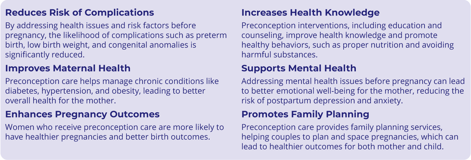 Enhancing the quality of preconception services is a crucial step in promoting maternal and child health, reducing health disparities, and achieving better health outcomes for families and communities.