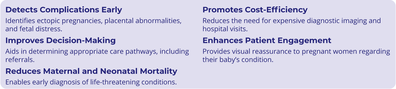 The integration of artificial intelligence (AI) into obstetric POCUS represents an important advancement in maternal healthcare. AI-enhanced ultrasound systems can improve image quality, automate key measurements, and assist in detecting abnormalities with greater accuracy and consistency. These technologies empower healthcare workers – including those with limited formal ultrasound training – to make better-informed clinical decisions.