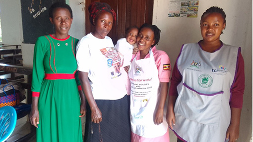 Mary (right) engaging with CHWs and community members.