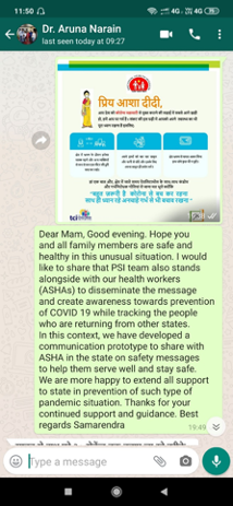 TCIHC adapted existing GOI information, education and communication materials related to COVID-19 with content specifically for ASHAs and ANMs that integrates family planning messages. The materials instruct ASHAs to take appropriate precautions during field work while reinforcing their important role in helping women avert unwanted pregnancies. Given the lockdown restrictions, TCIHC facilitated this adaptation and finalization of the materials with the GOI through existing WhatsApp Groups.