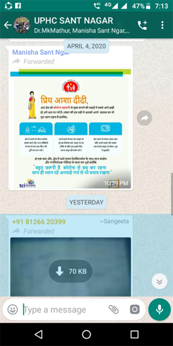 Once finalized, state officials shared the materials – which were developed in Hindi and customized for all three states – via existing WhatsApp groups of the National Urban Health Mission (NUHM) with urban primary health centers (UPHCs), ASHAs and ANMs.