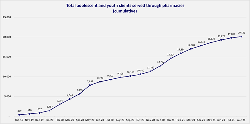 According to the Kenya National Family Planning Guidelines (6th edition), pharmacists and pharmaceutical technologists can counsel, dispense and provide condoms, pills and injectables as well as refer clients to nearby health facilities for long-acting reversible contraception (LARC) and permanent methods. This partnership is already delivering tangible benefits for adolescents and youth. The 50 pharmacies recruited in Mombasa County now serve over 20,000 youth as depicted in the graph below.
