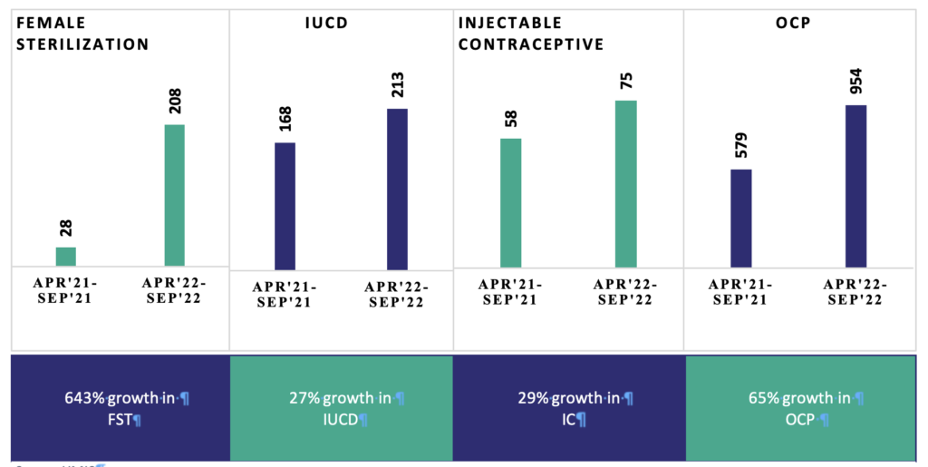 As shown in the private sector family planning HMIS data below private sector engagement activities started showing results. There was a substantial increase in family planning services uptake and reporting as apparent from April 2022 to September 2022 data compared to the same period the previous year.