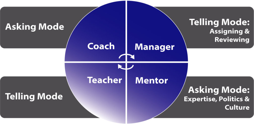 Le graphique ci-dessous met bien en évidence la principale différence entre les coachs et les autres leaders. Un coach croit fondamentalement que le coaché est naturellement créatif, ingénieux et complet. Par conséquent, il opère le plus souvent par des interrogations, posant des questions pertinentes au coaché pour l'aider à identifier des solutions et les prochaines étapes pour lui-même.