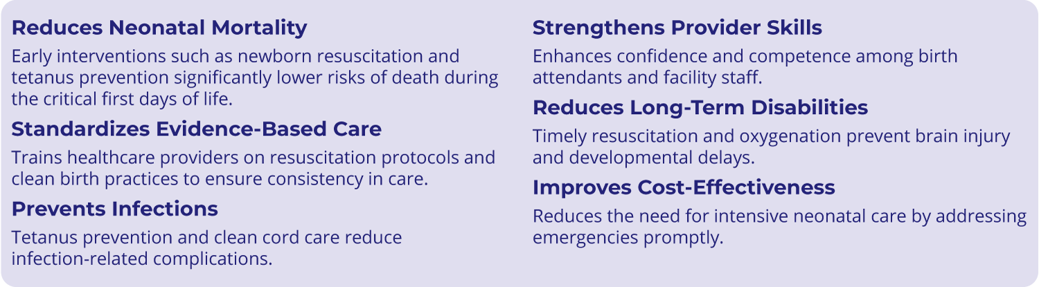 Bien que ces interventions s'attaquent à des risques différents, elles représentent toutes deux un engagement à développer des services néonatals de qualité à fort impact qui réduisent les décès évitables et s'alignent sur les objectifs mondiaux en matière d'amélioration des résultats néonatals.