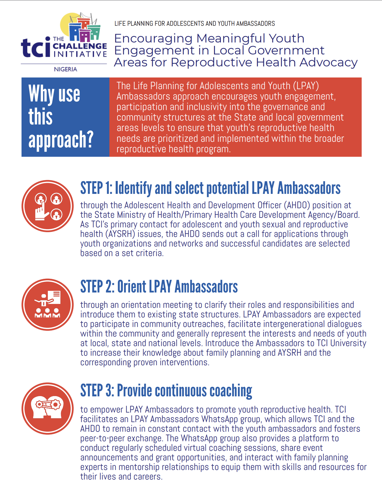 TCI soutient les États à faire participer les jeunes en tant qu'ambassadeurs LPAY. Les Ambassadeurs LPAY sont sélectionnés conjointement par TCI et les états ; officiellement décoré lors d'un événement d'état. Les ambassadeurs LPAY sont des jeunes - hommes et femmes - âgés de 15 à 35 ans qui résident dans l'une des TCI États d'intervention sélectionnés par l'AYRH. Ils parlent des priorités des jeunes dans l'État qu'ils représentent. Environ 20 ambassadeurs LPAY sont sélectionnés par état. Cela permet d'augmenter le nombre d'entraîneurs dans TCI géographiques, étant donné que les ambassadeurs LPAY soutiennent les TCI Les équipes d'État.