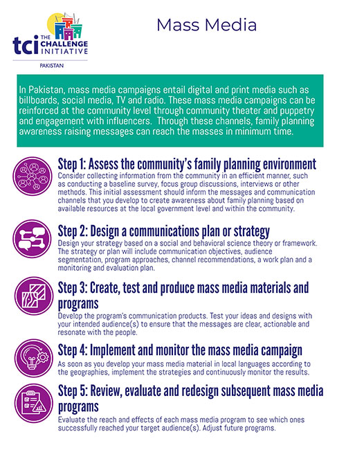Il existe plusieurs façons de générer une demande pour le planning familial et la santé sexuelle et reproductive des adolescents et des jeunes (AYSRH). Les campagnes dans les médias de masse constituent l'un des moyens les plus efficaces. Ces campagnes font appel aux médias numériques et imprimés tels que les panneaux d'affichage, les médias sociaux, la télévision et la radio. En outre, ces campagnes dans les médias de masse peuvent être renforcées au niveau communautaire par le biais du théâtre et des marionnettes communautaires et de l'engagement auprès des personnes influentes. Grâce à ces différents canaux, les messages de sensibilisation à la planification familiale peuvent atteindre les masses en un minimum de temps.