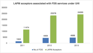 Le graphique suivant montre qu'une augmentation du nombre de jours de service fixe effectués dans des établissements choisis dans 11 villes de l'ICU a entraîné une augmentation correspondante du nombre d'accepteurs de méthodes à action prolongée et permanentes (LAPM).