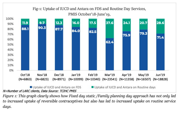The Challenge Initiative for Healthy Cities (TCIHC) a collaboré avec les gouvernements des États de l'Uttar Pradesh, du Madhya Pradesh et de l'Odisha afin de donner la priorité à la fourniture de services hebdomadaires à jour fixe pour les méthodes d'action rapide et d'action prolongée (LARC) telles que le dispositif contraceptif intra-utérin (IUCD) et Antara. Dans le cadre de cette collaboration avec le gouvernement, le TCIHC a assuré la disponibilité d'une main-d'œuvre qualifiée, d'équipements, de produits et de fournitures dans un établissement (UPHC) à un jour et une heure annoncés à l'avance et connus de la communauté. Les résultats peuvent être vus ci-dessous et dans ce Rapporter.