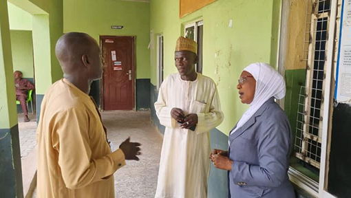 A ward development committee chairperson, health promotion officer and service provider discuss childbirth spacing at Gombe Town PHCC.