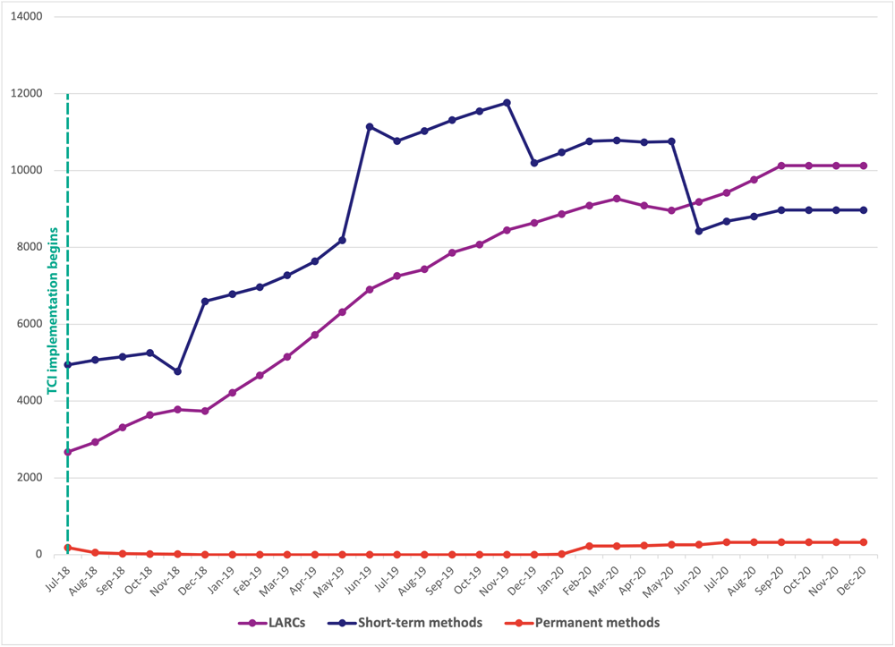 In-reaches had not previously been conducted in Abia state prior to TCI. As a result of TCI’s coaching model, in-reaches have now diffused throughout the state. This experience is significant because it illustrates the cascading effects of coaching as well as the diffusion and the impact of TCI primary best practice in Nigeria. TCI’s high-impact interventions in Abia state have contributed to a 279% increase in LARC uptake (denoted by the purple line in the graph below), which represents 7,456 new LARC users since TCI started implementation in July 2018.