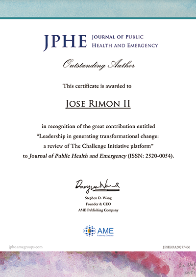 The Journal of Public Health and Emergency (JPHE) has recognized Jose “Oying” Rimon II, PgDip, MA, as one of its Outstanding Authors following the publication of his recent peer-reviewed article on The Challenge Initiative (TCI) platform. The recognition highlights articles that have generated strong interest among readers and contributed new insights to the field of public health.