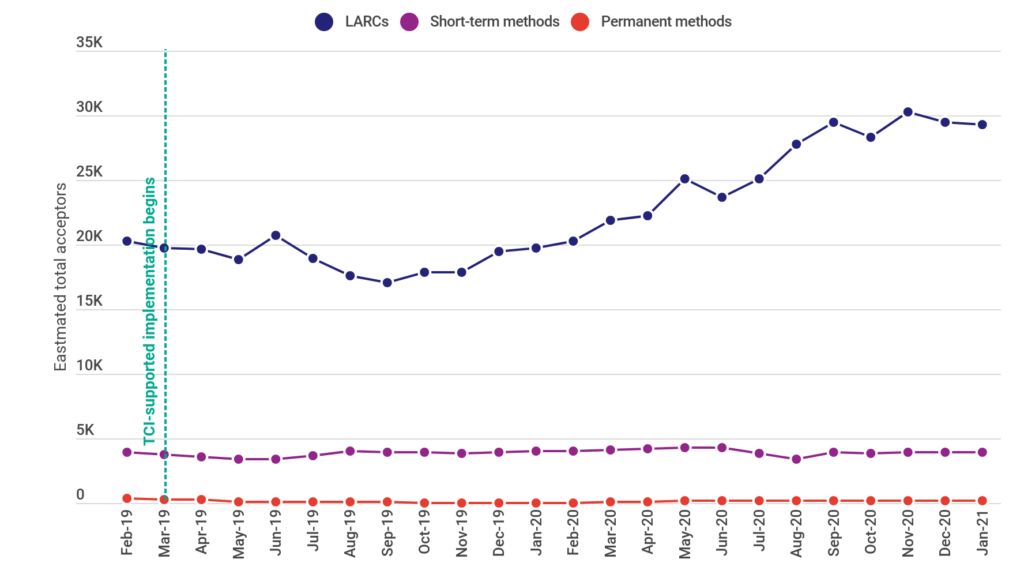 With the help of TCI, mentorship and coaching has resulted in an increase of new family planning uptake clients. TCI has contributed to a 48% uptake in LARC users since implementation started in March 2019 and overall annual client volume has increased by 41%.*