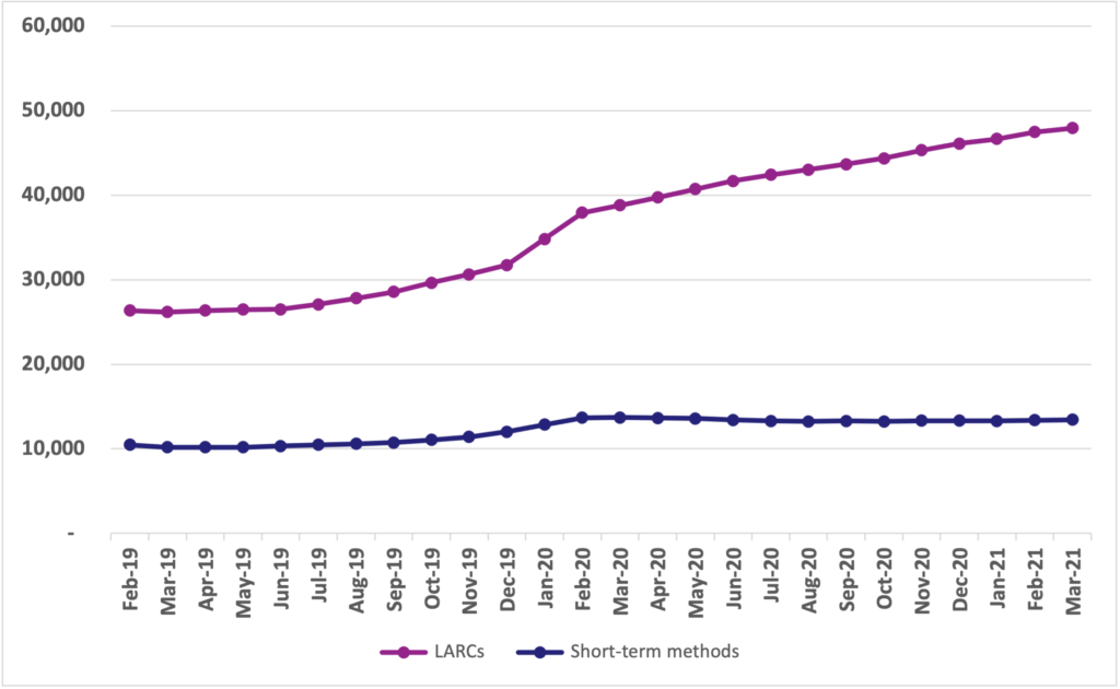 This active data collection has helped to address a number of Senegal’s DHIS2 data challenges in terms of completeness and quality. As a result, data from TCI’s dashboard, which pulls data from updated Senegal’s DHIS2 database, shows a 67% increase in annual client volume in TCI-supported geographies from February 2019 to March 2021, as depicted in the line graph below. This includes an 82% increase in long-acting reversible contraceptive users.