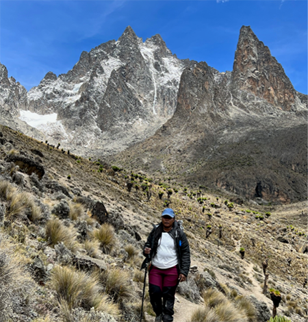 Dr. Njeri during one of her hiking challenges to summit Mt. Kenya, seen in the background.