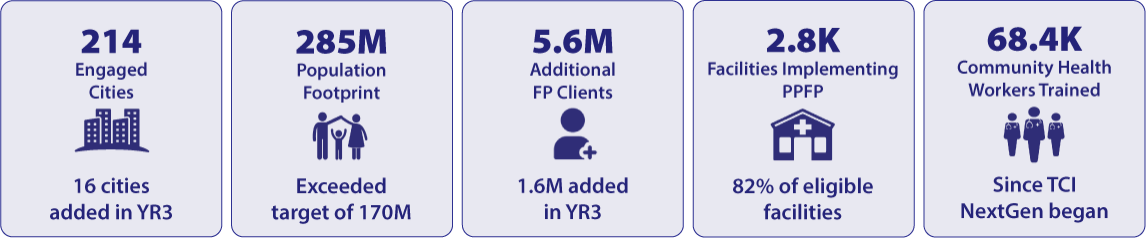 TCI continued building local capacity in the implementation of high-impact practices and other interventions, particularly postpartum family planning (PPFP). Nearly 2,800 health facilities now offer PPFP, and more than 25,000 providers have been trained, with 98% of TCI-supported cities incorporating PPFP into their local or national policies. Similarly, TCI exceeded its targets for the scale-up of community health worker engagement, in-reaches, adolescent-responsive services, and more.