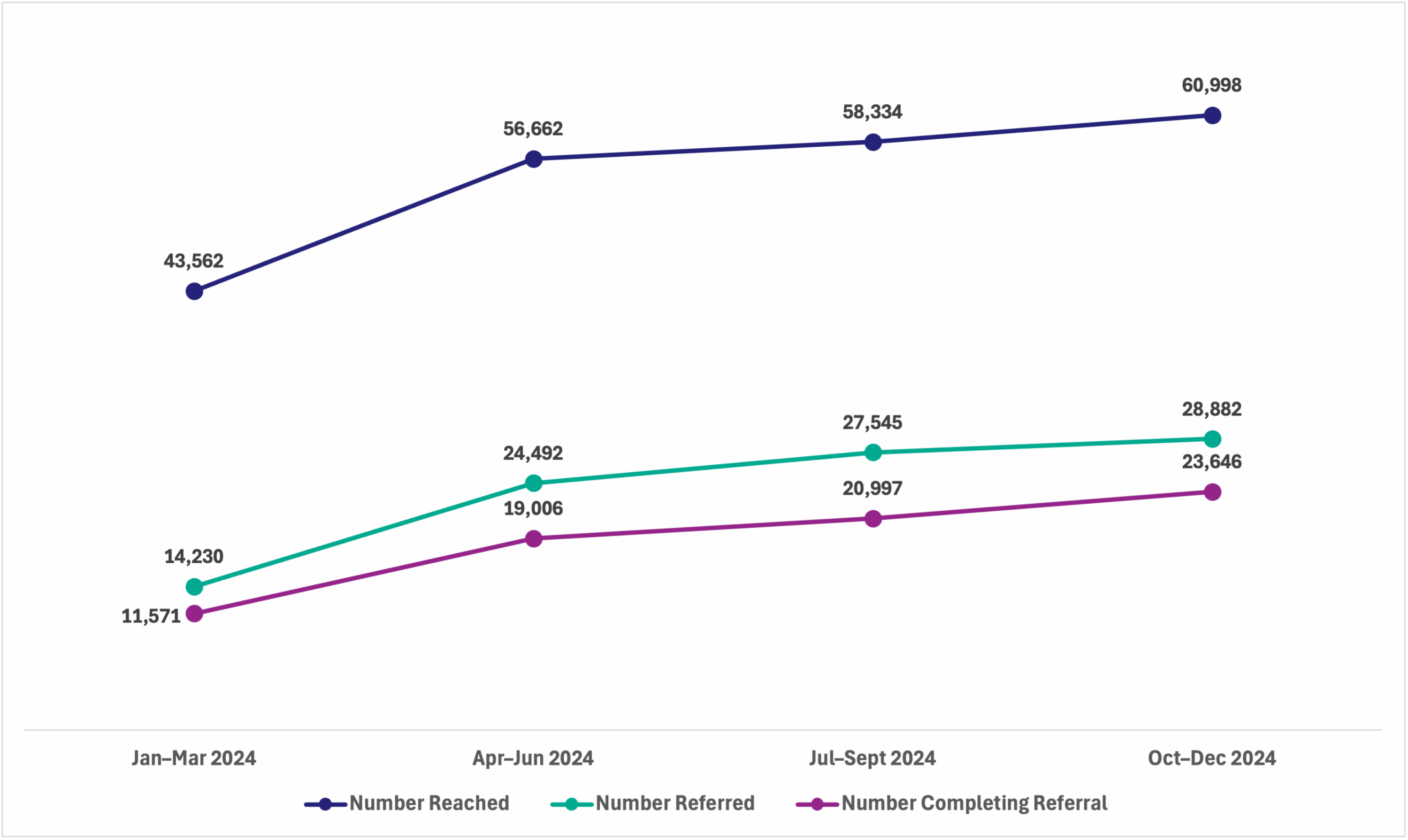 Demand generation efforts in Yobe State steadily increased throughout 2024, with more people reached, referred, and completing referrals each quarter.