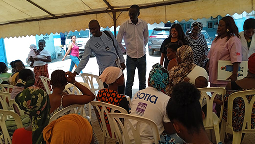 Dr. Mamadou Kandji (center in blue), TCI’s chief of party for Francophone West Africa, reaches out to women attending a free Family Planning Special Day in Koumassi.
