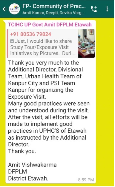 Both the Etawah and Farrukhabad teams found the knowledge exchange visit beneficial as reflected by the Divisional FPLMIS manager of Etawah sharing his gratitude to the Kanpur city team over the family planning community of practice on WhatsApp (see image, right). Through the Mini U, new cities in Uttar Pradesh are all set to replicate TCIHC’s HIAs and successes.