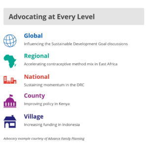 - مقامی حکومتوں کو علاقائی، صوبائی، ضلعی اور/یا گاؤں کی سطح پر خاندانی منصوبہ بندی/ اے وائی ایس آر ایچ کے وسائل کو ترجیح دینے کے وعدے کرنے میں مدد کرتا ہے